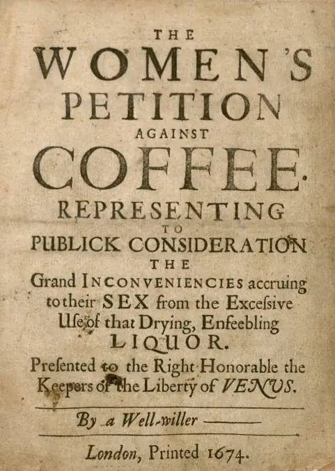 Erkeklerin evlerini, eşlerini ve işlerini ihmal ederek günlerce kahvehanelerde "gevezelik etmesi", kadınlar arasında büyük bir öfke yarattı. Bu öfke, 1674 yılında yayımlanan isimsiz bir broşürle patlak verdi: "The Women's Petition Against Coffee" (Kadınların Kahveye Karşı Dilekçesi).